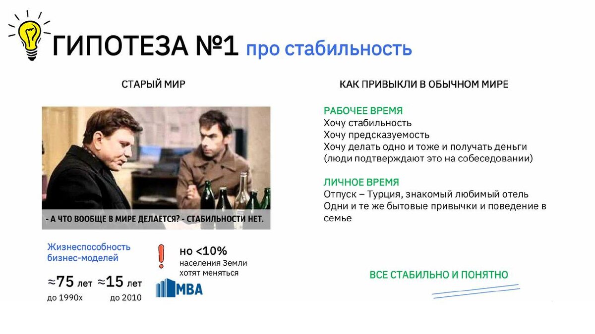 Правило 1 Стабильность закончилась. «Хочу, чтобы это уже поскорее прекратилось, всё встало на свои места»… «Хочется стабильности, определённости»… Признавайтесь, есть соблазн рассчитывать на это? Всё еще в глубине души верите в стабильность? Понятный рынок. Слаженная команда. Понятные правила. Понятный горизонт. И в этом месте хочется понимающе кивнуть: да, мы тоже скучаем по миру, в котором виден горизонт планирования. Когда можно купить путёвки в отпуск на август ещё в январе, составить календарь мероприятий и быть уверенным, что всё задуманное состоится. Пересматривали архивы с февральского тура-погружения в Новосибирск. На экскурсии в Smart Consulting Дмитрий Гоков, основатель компании начал встречу не с демонстрации оргструктуры, не с инструментов... «Я до сих пор работаю с кадрами. Я до сих пор слушаю рынок. И я спрашиваю людей: «А что вы ищете? Что вы ждёте?» И все говорят про какую-то стабильность. Но, к сожалению, мир вокруг меняется очень быстро. Сегодня стабильность –