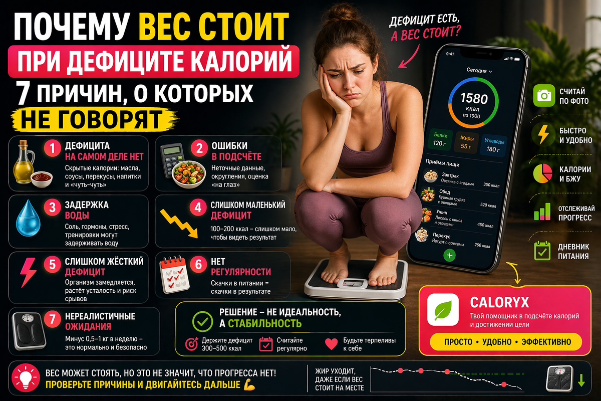👉 0.5–1 кг в неделю Часто проблема не в знаниях, а в том, что: 👉 человек просто перестаёт вести учёт Важно, чтобы подсчёт был быстрым и удобным. Например, в Caloryx можно: 👉 Это снижает шанс бросить на середине. Если вес стоит — проверь: 👉 В 90% случаев причина находится здесь. Запомни: