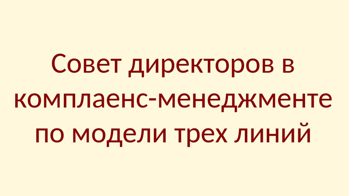Я переложил модель трех линий IIA на комплаенс-менеджмент. Хотя в самом документе комплаенс почти не упоминается, комплаенс-риски – один из видов рисков, для управления которыми разработана эта модель. Еще я добавил немного своих комментариев. Это относится и к будущим постам. Совет директоров (СД): 1. Контролирует работу компании, в т.ч. законность и этичность. СД делает это добросовестно и прозрачно, проявляет лидерство. 2. Определяет миссию, ценности и стратегию развития компании. Там может упоминаться приверженность законности, этичности, лучшим практикам, принципам устойчивого развития и т.п. 3. Следит, чтобы цели и деятельность компании соответствовали интересам стейкхолдеров. Задача СД – выявить эти интересы и проинформировать стейкхолдеров о достижении оговоренных целей. 4. Определяет риск-аппетит компании и контролирует управление комплаенс-рисками. 5. Организовывает эффективное корпоративное управление: 5.1. Дает менеджменту и внутреннему аудиту ресурсы и полномочия для управ