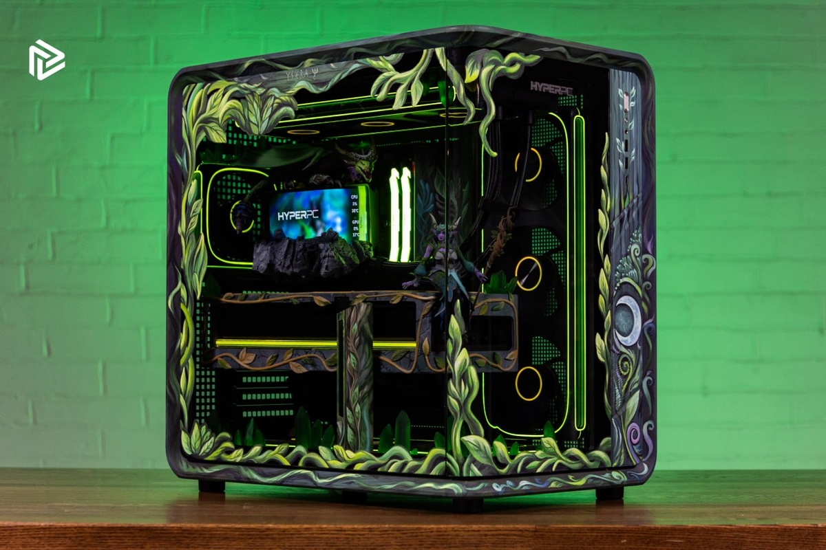 Второй раз мы делаем спец проект для ребят и в этот раз нам было необходимо сделать Арт-объект в стиле World of Warcraft и персонажа Ysera из ПК не прибегая к кастомному водяному охлаждению! Это был интересный вызов и очень не простой проект, в который мы вложили много сил, времени и конечно же всю душу! - Разработан единый и атмосферный дизайн для корпуса и внутренних элементов по заданной тематике - Нарисованы с нуля, и напечатаны 3D модели обеих форм заданного персонажа: Друид и дракон. Моделям при создании сделан скелет для правильного позиционирования внутри ПК. - Экран охлаждения с помощью 3D модели стилизован под скалу, на которой сидит дракон. - Для видеокарты сделан и напечатан кастомный 3D "Full cover" кожух в общей стилистике, полностью изменяющий её дизайн. - Разработаны в 3D и напечатаны кристаллы двух цветов для украшения системы изнутри. - Расписаны в ручную со всех сторон: Корпус и стекла снаружи, подставка для видеокарты и заглушка проводов внутри. - Все 3D модели рас