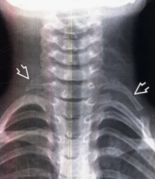 Второй по частоте причиной компрессии СНП в области плечевого пояса являлось шейное ребро. Являясь врождённой, у большинства людей эта патология может в течение всей жизни не проявляться. Как было отмечено выше, данный синдром был представлен 2 формами - ДШР и РШР. Когда длина шейного ребра составляла более 25 мм, то это обозначалось как ДШР, если менее - РШР. Шейные рёбра отходили от поперечного отростка VII шейного позвонка (CVII) и формировали с ним сустав. Свободный конец шейного ребра направлялся в сторону первого ребра, формируя с ним дополнительный сустав. Нередко оно срасталось с первым ребром без образования сустава. Основным методом диагностики этой формы являются рентгенография и КТ. На рис. 2 отражены рентгенологические признаки двухстороннего процесса (ДШР+РШР).
