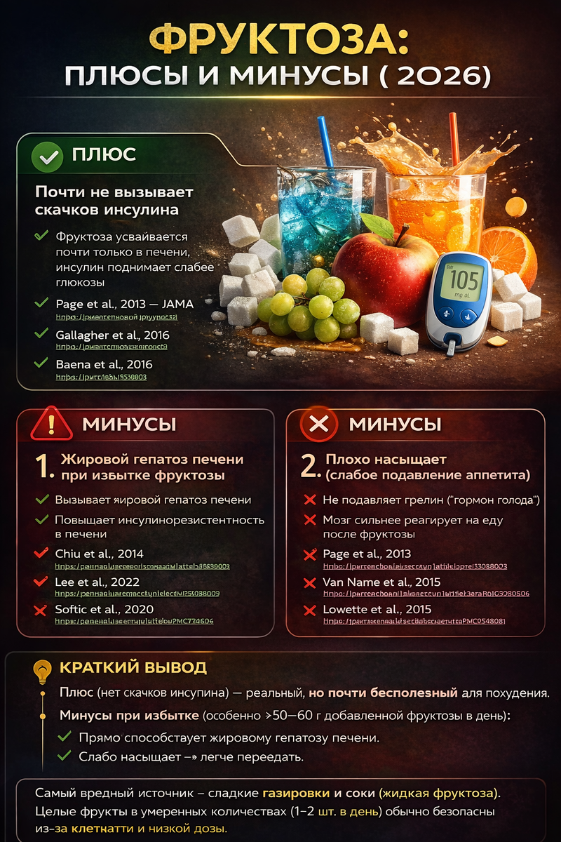 Плюс: фруктоза почти не вызывает скачков инсулина Это правда. Фруктоза метаболизируется преимущественно в печени и минимально стимулирует секрецию инсулина по сравнению с глюкозой. Page et al., 2013 (JAMA) — классическое исследование: фруктоза вызывает значительно меньший подъём инсулина и GLP-1, чем глюкоза. Ссылка: https://jamanetwork.com/journals/jama/fullarticle/1555133
