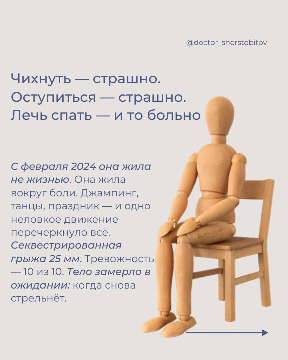 НЕ ЧУДО. СИСТЕМА Чихнуть — страшно. Оступиться — страшно. Лечь спать — и то больно. С февраля 2024 она жила не жизнью — она жила вокруг боли. Джампинг, танцы, праздник… и одно неловкое движение перечеркнуло всё. Секвестрированная грыжа 25 мм. Тревожность — 10 из 10. Тело замерло в ожидании: когда снова стрельнёт. А теперь — МРТ в руках. Грыжа уменьшилась на 9 мм. Тело начало восстанавливаться. Не чудом — а стабильной работой и внимательностью к перегрузкам.э «Грыжа не уходит от покоя. Она уходит, когда тело перестаёт бояться и входит в систему». Мы не «лечили» грыжу напрямую. Мы дали телу условия, в которых оно само смогло начать её уменьшать. Лёгкие упражнения на кровоснабжение. Стабилизация. Подвижность корешков. Снятие спазма грушевидной мышцы. Уменьшение хронического напряжения. Работа с тревогой в теле. Каждое упражнение было сигналом нервной системе: 👉 опасности нет 👉 можно отпустить 👉 можно включить иммунные клетки, которые и уменьшают грыжу «Чихнула — и сразу в ягодиц