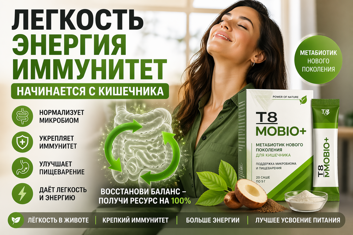 ❌ усиливается тревожность ⚠️ Симптомы, которые легко игнорировать Вы могли сталкиваться с этим: И, возможно, думали: «у всех так» 👉 но это не норма Всё упирается в микробиом кишечника — экосистему бактерий, которая влияет на: Когда баланс нарушается: 👉 организм просто не получает то, что вы едите Вы можете выбирать полезные продукты, но если микробиом нарушен: 👉 питание не работает так, как должно И вы остаётесь в дефиците, даже не замечая этого Важно не просто добавлять витамины, а восстановить среду, в которой организм способен их усваивать В этом контексте стоит обратить внимание на T8 MOBIO+ Это метабиотик нового поколения, который работает гл