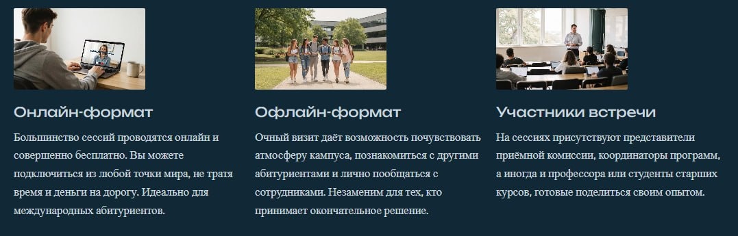 Пока большинство изучает сайты вузов и читает буклеты — единицы делают то, что реально меняет исход поступления. Рассказываем, что именно. Это онлайн или офлайн встречи с официальными представителями университета — сотрудниками приёмной комиссии, координаторами программ, а иногда и профессорами и действующими студентами. Формат может быть разным: вебинары, экскурсии по кампусу, панельные дискуссии или Q&A-сессии. Но суть одна — вы получаете прямой доступ к информации из первых уст. Пройдите нашу бесплатную экспресс-диагностику от SelfStartGlobal! Мы поможем оценить ваш профиль и понять, насколько вы соответствуете требованиям ведущих университетов мира. Получите конкретные ответы для вашей ситуации.