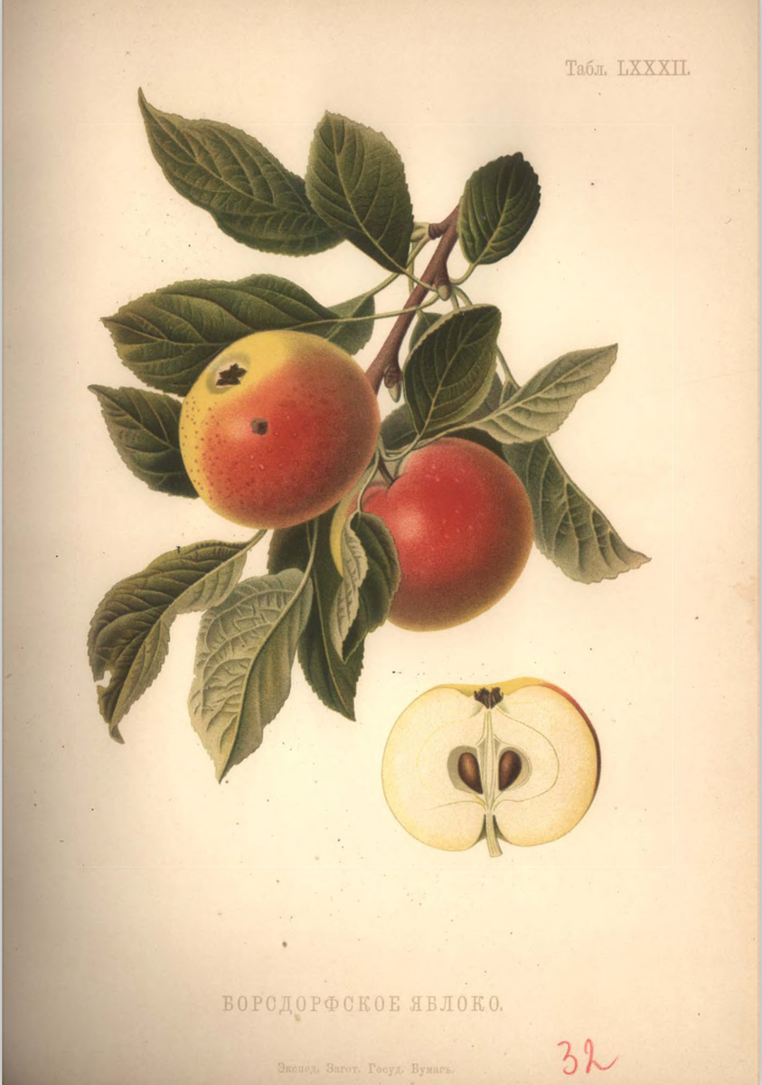 Вероятно, это случайный сеянец «Благородного», который возник в Лифляндии и блестяще адаптировался к суровому северному климату. * Плод: Маленький, сильно сплюснутый (отсюда и название «Луковичное» — Zwiebelapfel), с характерной плоской вершиной и пятью слабыми гранями. Окраска более скромная: изначально зеленовато-бурая, в лежке она переходит в золотисто-желтую с красноватыми пятнами. * Мякоть: Белая, плотная и хрустящая. Сохраняет приятный, характерный для борсдорфских яблок сладко-винный вкус. * Особенности дерева и хранение: Этот сорт был абсолютным рекордсменом лежкости и выносливости. В прохладных подвалах яблоки без проблем лежали до мая, а при аккуратном обращении сохранялись круглый год! Кроме того, плоды превосходно переносили самую грубую транспортировку в недозревшем виде. Деревья-спартанцы жили по 150 лет и более, мирились с бедными почвами без всякого ухода, а благодаря очень позднему сроку цветения совершенно не боялись весенних заморозков.
