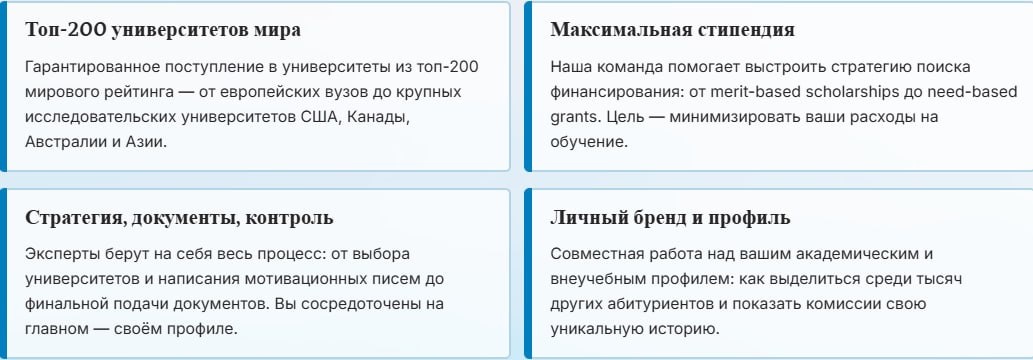 Два флагманских формата работы SelfStart — самые наполненные услуги на рынке поступления в зарубежные университеты. Разбираемся, чем они отличаются и какой формат подходит именно вам. Этот формат создан для тех, кто хочет поступить в сильный университет мира и передать всю стратегию и контроль процесса в руки экспертов. Вы работаете над своим профилем вместе с командой — и получаете результат. Формат подходит, если у вас есть от 6 месяцев до дедлайна подачи документов и вы готовы активно работать над своим развитием вместе с кураторами. Премиум-формат — это комплексное решение «под ключ» для тех, кто нацелен на лучшие университеты мира и хочет, чтобы одна команда сопровождала их на каждом этапе: от подготовки к экзаменам до адаптации после переезда. Оба формата — самые наполненные услуги на рынке. Но Премиум Полное Сопровождение создавалось специально для того, чтобы закрывать абсолютно все вопросы поступления — включая те, что возникают уже после получения оффера. Мы даём такие гарант