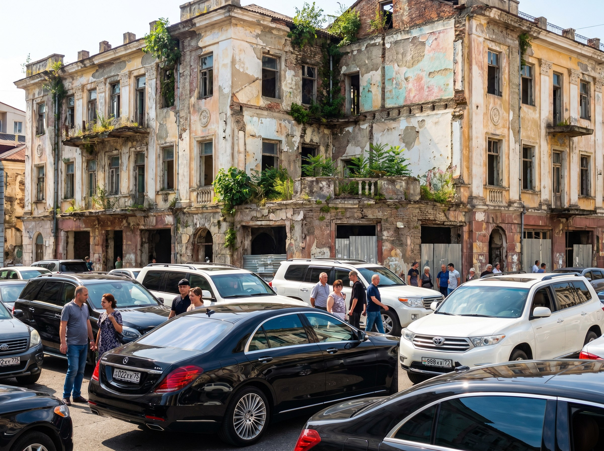 А на фоне всего этого по улицам разъезжают блестящие новенькие Mercedes, BMW, Lexus, Range Rover. Машины стоимостью по четыре-пять миллионов рублей, с местными номерами. Абсурд какой-то: вокруг разруха, а люди катаются на премиальных внедорожниках.