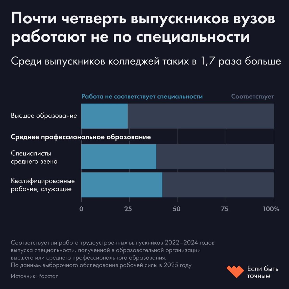В 2022–2024 годах 24% выпускников российских вузов работали не по специальности. Для сравнения: среди выпускников программ подготовки специалистов среднего звена таких 39%, а среди квалифицированных рабочих — 42%. Такие данные приводит Росстат в Выборочном обследовании рабочей силы. 🔸 Выпускники вузов. Самая высокая доля занятости по специальности — в медицине: в клинической медицине по профилю работают 99% выпускников, в фармации — 97%, в сестринском деле — 96%. В целом здравоохранение и образование остаются направлениями, где трудоустройство по специальности рассматривается как ключевой показатель эффективности подготовки. Чем сильнее обучение по профессии ориентировано на формирование специализированных навыков, тем чаще выпускники работают по своей специальности, замечает главный научный сотрудник Института социологии ФНИСЦ РАН Галина Чередниченко. И наоборот: чем больше в образовании упор на общий человеческий капитал, тем выше вероятность, что работа не будет совпадать с получен
