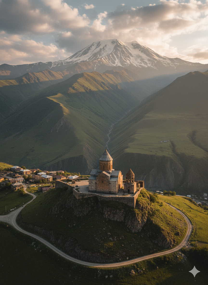 Подъём к храму занимает около полутора часов пешком или несколько минут на внедорожнике от поселка Степанцминда. Вид со смотровой площадки у стен — один из самых захватывающих на Кавказе: Казбек как на ладони, внизу зелёные долины, а вокруг — абсолютная тишина высокогорья. Ехать в Грузию и не побывать здесь — это как приехать в Париж и не увидеть Эйфелеву башню.