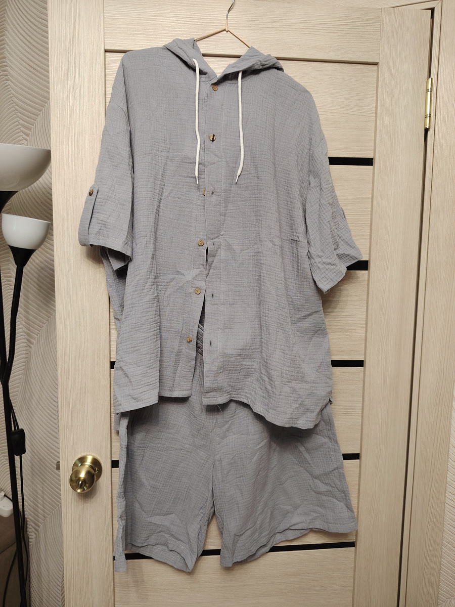 Муслиновый костюм с капюшоном, для мужа, он полностью х.б, жатка, тонкий и лёгкий, предполагаю, что он из него вылазить не будет 😉