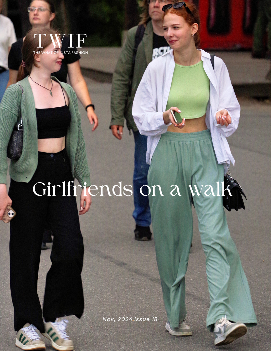 В свежем выпуске независимого fashion-журнала уличная съёмка превращается в почти кинематографичный рассказ о молодости, дружбе и стиле без усилий. Серия кадров с двумя девушками — это не просто street style, а живая сцена, в которой мода не позирует, а дышит. Перед нами две героини с очень разной, но гармонично сочетающейся внешностью. Первая девушка — с рыжеватыми волосами, собранными в аккуратный низкий пучок. Лицо открытое, с лёгкой улыбкой и мягким, уверенным взглядом. Её кожа выглядит естественно — макияж почти незаметен: лёгкий тон, немного румян, натуральный оттенок губ. Образ завершает расслабленная уверенность — она словно не позирует, а просто живёт в кадре. Её одежда — воплощение современной casual-эстетики: укороченный топ нежного салатового оттенка подчёркивает фигуру, поверх — лёгкая белая рубашка, небрежно накинутая, как защита от ветра. Широкие брюки в тон создают ощущение комфорта и свободы движения. На ногах — кроссовки, а на голове — солнцезащитные очки, поднятые к