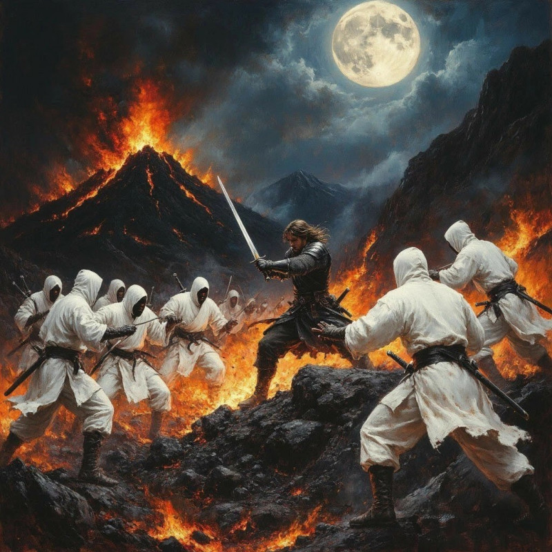 Мельхар рванулся было вперёд, на помощь, но его заставили остановиться. Наёмники-зерральты, лучшие в своём роде специалисты по маскировке и внезапному нападению, поднялись на ноги, стряхивая с циновок, под которыми они прятались, вулканический пепел. Семь воинов, у каждого из которых за спиной торчало по двуручному мечу, а в руках были зажаты короткие, но мощные луки, стрелы лежали на тетивах, готовые отправиться в цель по желанию своих владельцев. Лица воинов скрывали маски из светлой ткани с прорезями для глаз и носа.