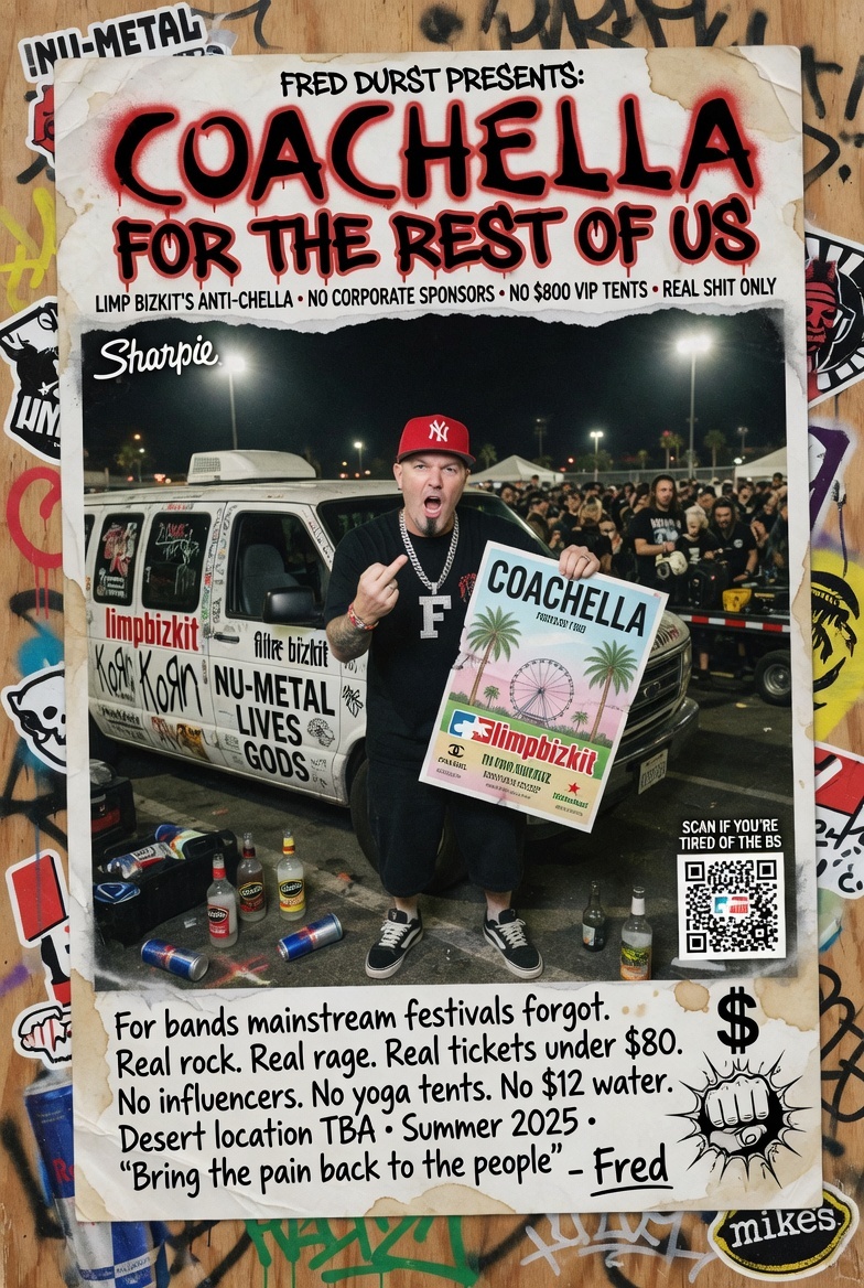 Фронтмен Limp Bizkit снова перетягивает внимание на себя, причём делает это максимально дерзко. Пока индустрия следит за главными фестивальными заголовками, Фред Дёрст открыто заявляет о создании собственного мероприятия для тех, кого фестивальные боги обделили вниманием. Его идея — организовать масштабный сбор артистов, оставшихся за бортом больших глэмовых лайнапов и корпоративных