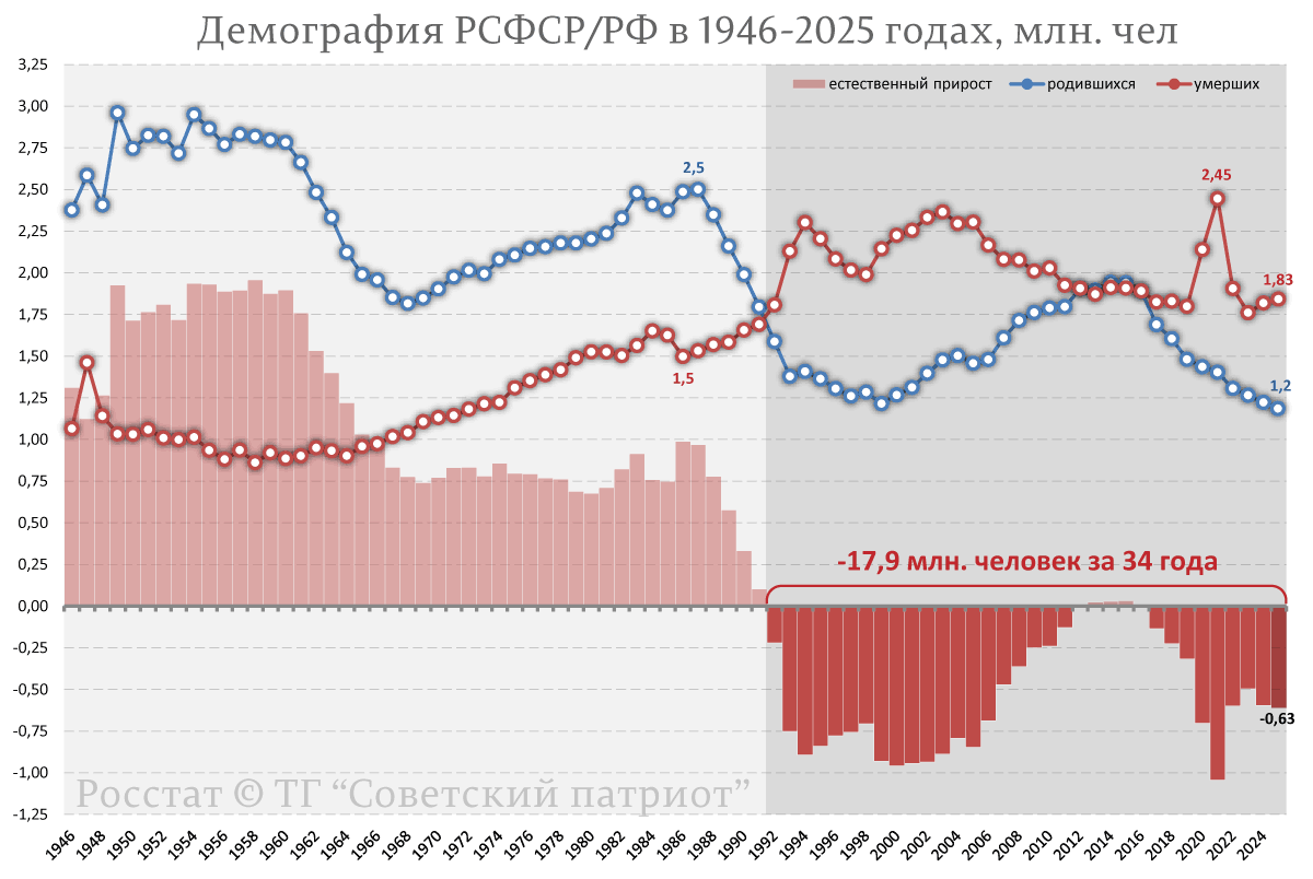 Высокое начальство в лице Валентины Матвиенко внезапно озаботилось обезлюживанием территорий России, назвав это стратегической угрозой. Добавив, что: Нам нужно добиваться равномерного расселения, чтобы люди не ютились в квартирах в нескольких крупных городах вдали от родных мест, а строили по всей стране просторные дома, заводили большие семьи - таким, на мой взгляд, должен быть образ будущего. Тут сложно в чём-то возразить Валентине Ивановне: действительно, страна ударно вымирает с 1992 года, потеряв за счет превышения смертности над рождаемостью порядка 18 миллионов человек: Тут важно еще заметить, что процесс вымирания российского народа носит неравномерный характер, ударив главным образом по территориям с государствообразующим населением: Внутри же этих территорий, кроме общего вымирания добавился процесс бегства населения из глубинки в крупные города и центры. То есть против факта обезлюживания российских территорий не попрёшь. Осталось только понять, кто всё это сделал, что народ