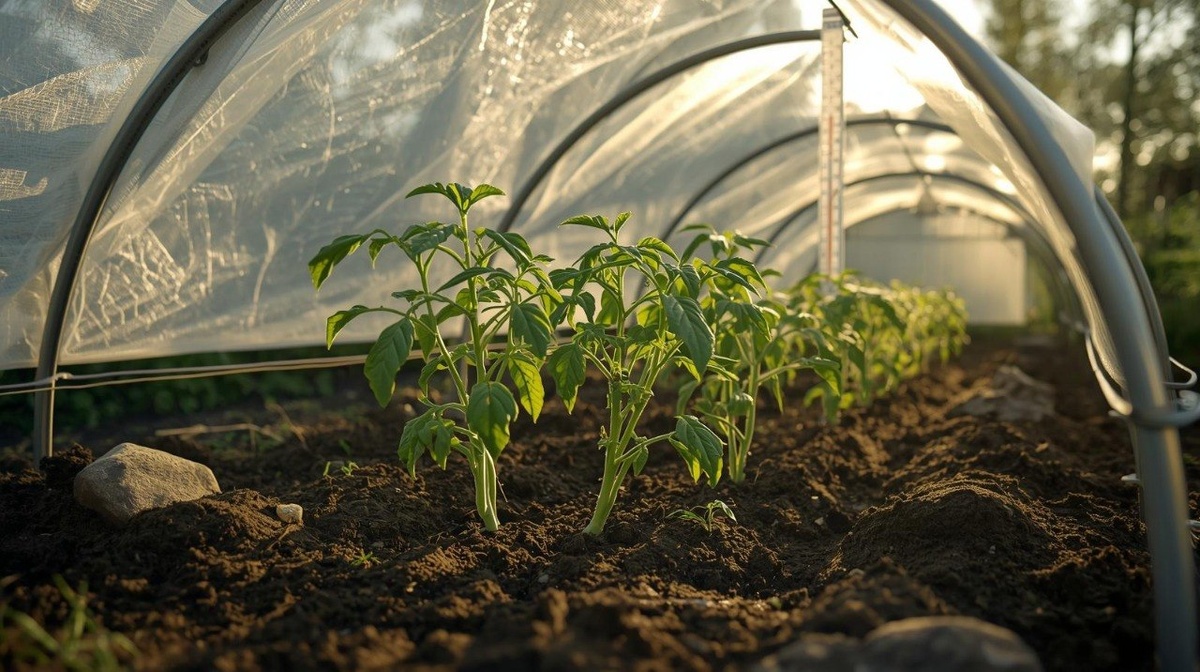 Когда высаживать: рассаду томатов и перцев в открытый грунт в Сибири высаживают с 1 по 10 июня, когда минует угроза возвратных заморозков, а почва на глубине 10 см прогреется до +15…+18°C. Для теплицы сроки сдвигаются на 15–25 мая (в обогреваемую — ещё раньше). Ориентир не по календарю, а по погоде: если ночью стабильно выше +8°C, а днём +18…+22°C — можно сажать. За 5–7 дней до высадки рассаду обязательно закаляют: выносят на балкон или в теплицу на 2–3 часа, постепенно увеличивая время до полного дня. Укрытие на ночь: даже в июне в Сибири возможны заморозки до -2…-3°C, поэтому первые 2–3 недели после высадки укрывайте растения на ночь. Лучший вариант — двойной слой спанбонда (белого агроволокна) плотностью 30–40 г/м²: он пропускает свет и воздух, но сохраняет тепло. Можно использовать пластиковые 5-литровые бутылки с обрезанным дном (колпаки) для каждого куста — они создают парниковый эффект. Томаты и перцы критичны к холоду: при +5°C их рост останавливается, при 0°C цветочные почки