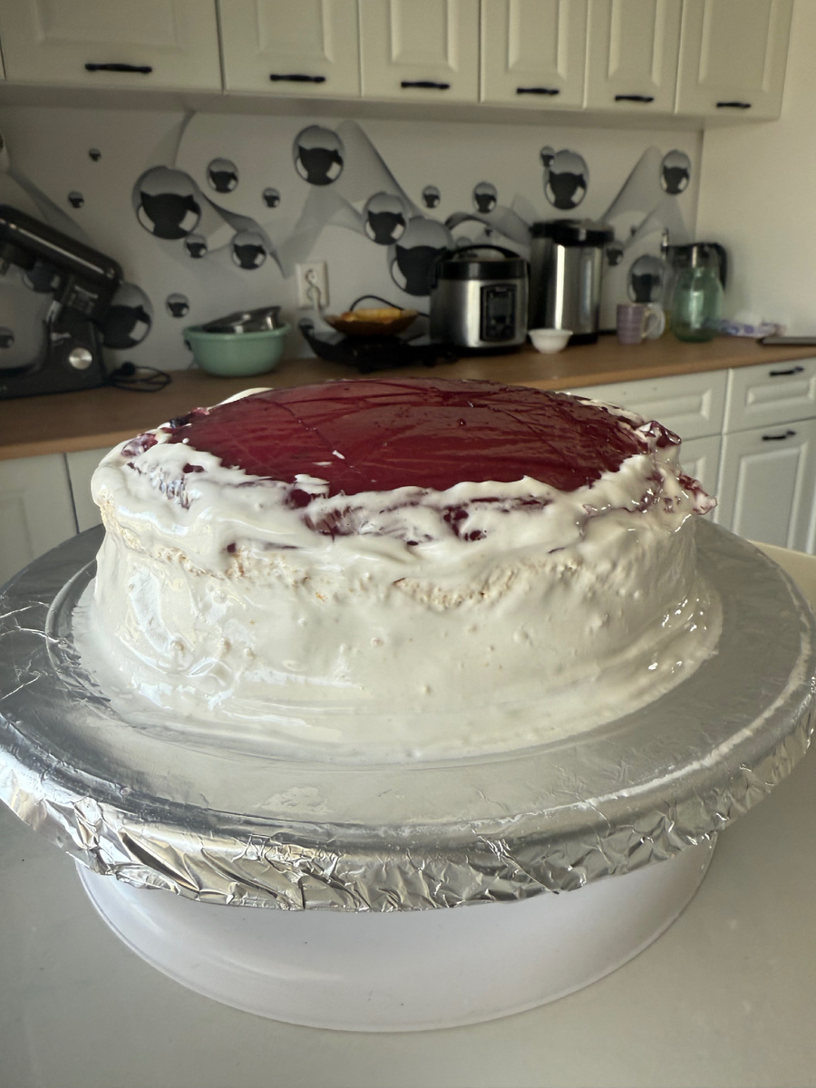 - Поставьте торт в холодильник на 3–4 часа (лучше на ночь), чтобы желе полностью застыло и крем стабилизировался.