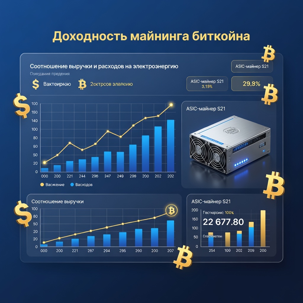 Прежде чем вкладывать деньги в майнинговое оборудование, необходимо точно рассчитать ожидаемую доходность. Неправильные расчёты являются главной причиной убыточных майнинговых операций. В этой статье разберём все составляющие формулы доходности. Базовая формула доходности BTC: (ваш хешрейт / хешрейт сети) умножить на количество блоков в день и вознаграждение за блок. В 2026 году сеть добывает примерно 144 блока в день, вознаграждение составляет 3,125 BTC после халвинга 2024 года, хешрейт сети около 800 EH/s. Чистая прибыль складывается не только из добытых монет. Главной статьёй затрат является электроэнергия. Современный Antminer S21 потребляет около 3500 Вт при хешрейте 200 TH/s. При тарифе 5 рублей за кВт/ч ежемесячные расходы составят около 12600 рублей. Комиссия пула является ещё одной статьёй расходов. При комиссии 2% с ежемесячного дохода в 50000 рублей вы отдаёте пулу 1000 рублей в месяц и 12000 рублей в год. Сравните комиссии всех пулов в нашем рейтинге и найдите самый выгодны