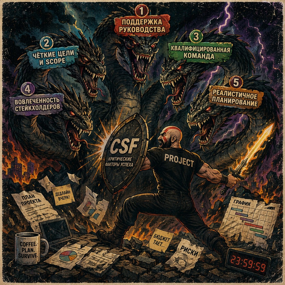 Часть 2: Факторы 1-5 В прошлом посте разобрали историю CSF — концепции, которая помогает понять, почему 30% проектов успешны, а 70% проваливаются. Сегодня — про первые 5 факторов. С примерами успехов и провалов. 1️⃣ Поддержка руководства Проект должен иметь спонсора на уровне топ-менеджмента. Спонсор защищает проект, выделяет ресурсы, решает конфликты приоритетов. Почему критично: Без поддержки сверху проект теряет приоритет. Бюджет урезают. Людей "одалживают" другим проектам. Проект медленно умирает. ✅ Успех: Сбер поддерживал СберБанк Онлайн на уровне CEO → проект получил всё необходимое, команда знала, что за ними стоит руководство ❌ Провал: Внутренний проект без спонсора → через 3 месяца заморозили, потому что "появились более важные задачи" 2️⃣ Чёткие цели и scope SMART-цели проекта. Все понимают ЧТО делаем, ЗАЧЕМ, ДЛЯ КОГО. Границы чётко определены: что входит в проект, а что НЕ входит. Почему критично: Без чётких целей команда работает вслепую. "А мы то думали нужно сдел