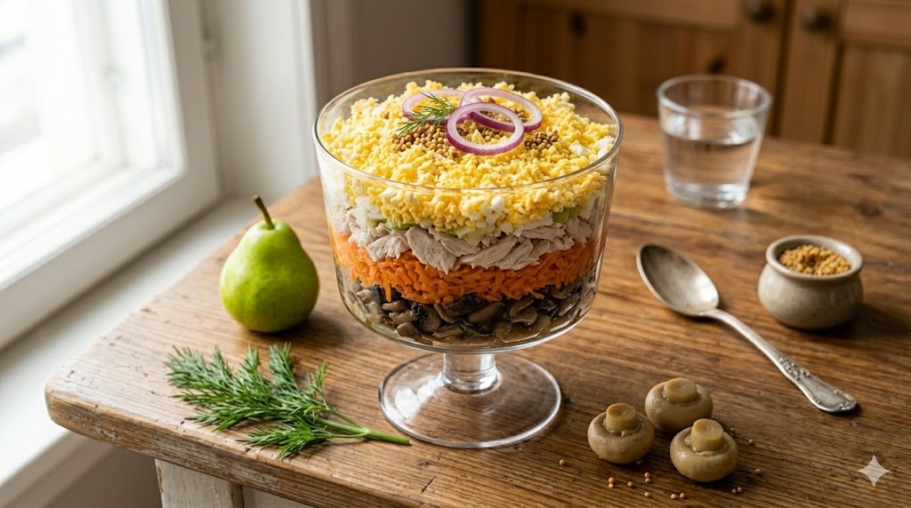 Я готовила этот салат лет десять по стандартной схеме. Грибы из банки, сырой лук, майонез между слоями — и в холодильник. Через три часа доставала, резала, раскладывала по тарелкам. И каждый раз было одно и то же: что-то не то. Вроде и ингредиенты правильные, и слои на месте, а вкус плоский. Один слой перебивает другой. Лук чувствуется везде, хотя его совсем немного.