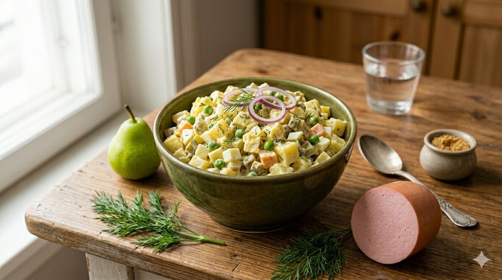 Потом подруга рассказала, что в Чехии этот салат подают на Рождество. Не как закуску. Как главное блюдо праздничного стола. Я не поверила. Полезла читать. Оказалось — правда. Чехи, поляки, немцы кормят этим салатом уже сто лет и не считают его простым. Они считают этот салат правильным.