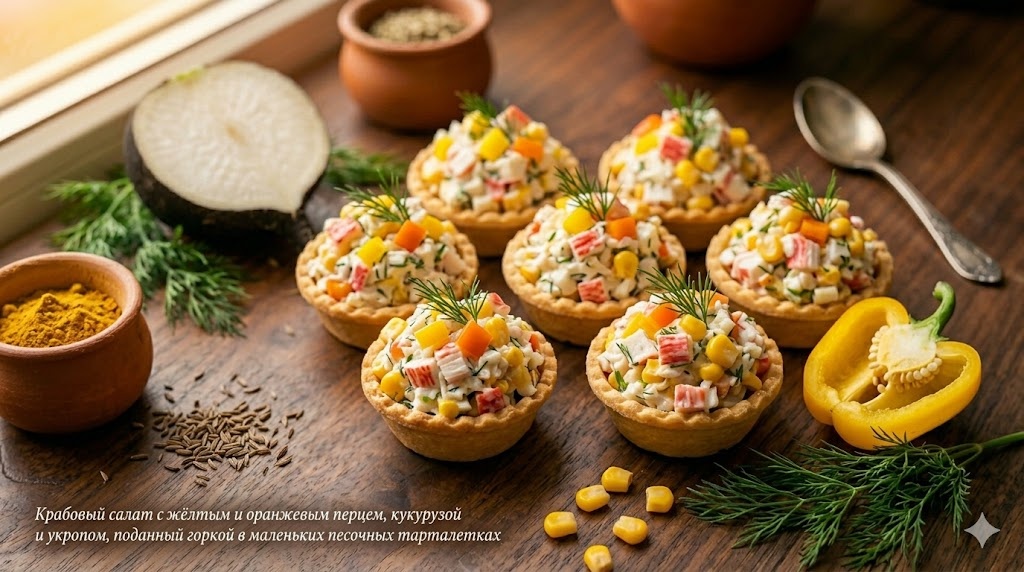 Ранняя заправка: крабовые палочки и тарталетки оба впитывают влагу быстро. Палочки становятся мягкими и теряют вкус, тарталетки размокают. Максимум что можно сделать заранее, нарезать и смешать все сухие ингредиенты салата. Заправка только в последний момент.