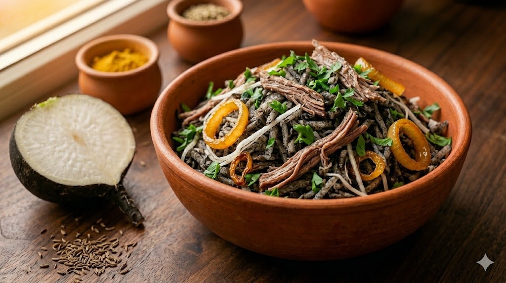 Ташкентский салат из редьки с мясом знают в Средней Азии давно. В самаркандских и ташкентских чайханах его подают как само собой разумеющееся. Никаких изысков. Редька, лук, мясо, специи. Но есть нюанс, без которого этот салат не работает: лук жарят, а не тушат. Именно жарят. На сильном огне, с корочкой. И это меняет всё.