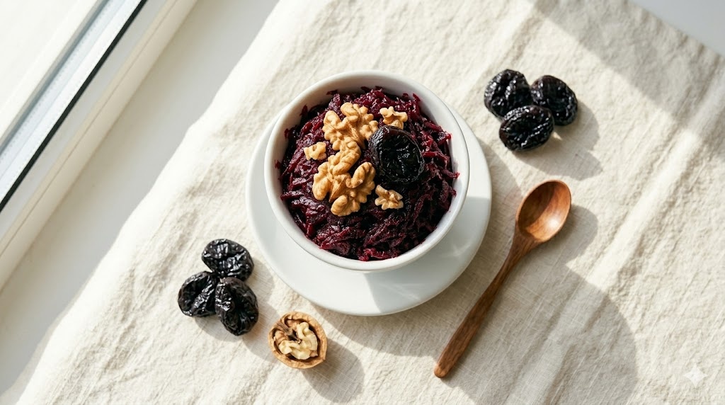 Этот салат я ставлю на стол каждую зиму. Он простой по составу, но когда сделан правильно: с яблочным уксусом, с мягким черносливом и хрустящим орехом сверху, он всегда уходит первым. Попробуйте приготовить его порционно, в стаканчиках. Гости всегда удивляются, что это та самая свёкла с черносливом, которую они знают с детства.