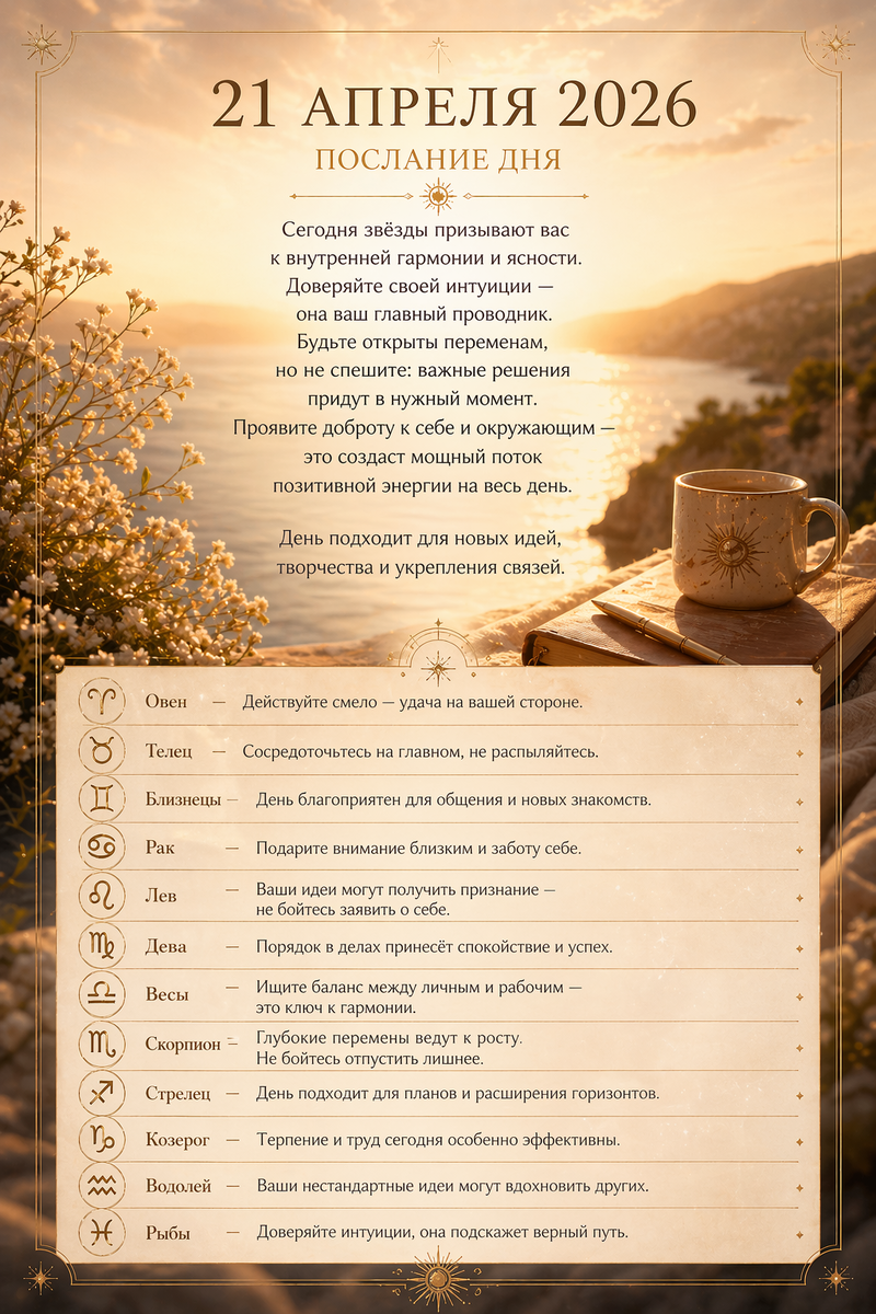 Послание дня: 21 апреля 2026 — день внутренней ясности, спокойной силы и правильных решений. Не торопи события, но и не бойся двигаться вперёд. Всё важное сегодня раскрывается через внимательность, честность и доверие к себе. 21 апреля 2026 по знакам зодиака: Овен — день требует решительности, но без лишней спешки. Уверенный шаг принесёт больше, чем рывок. Телец — сосредоточься на стабильности и своих истинных желаниях. Сегодня важно не распыляться. Близнецы — слова будут особенно сильными. Хороший день для общения, идей и нужных знакомств. Рак — прислушайся к чувствам. То, что кажется мелочью, может оказаться важным знаком. Лев — день подталкивает к проявлению себя. Не прячь талант и не занижай свою силу. Дева — порядок в делах принесёт внутреннее облегчение. Сегодня многое решается через внимание к деталям. Весы — ищи баланс между желаниями и обязанностями. Гармония придёт через честность с собой. Скорпион — возможны сильные эмоции, но именно они помогут понять, что пора менять. Стре
