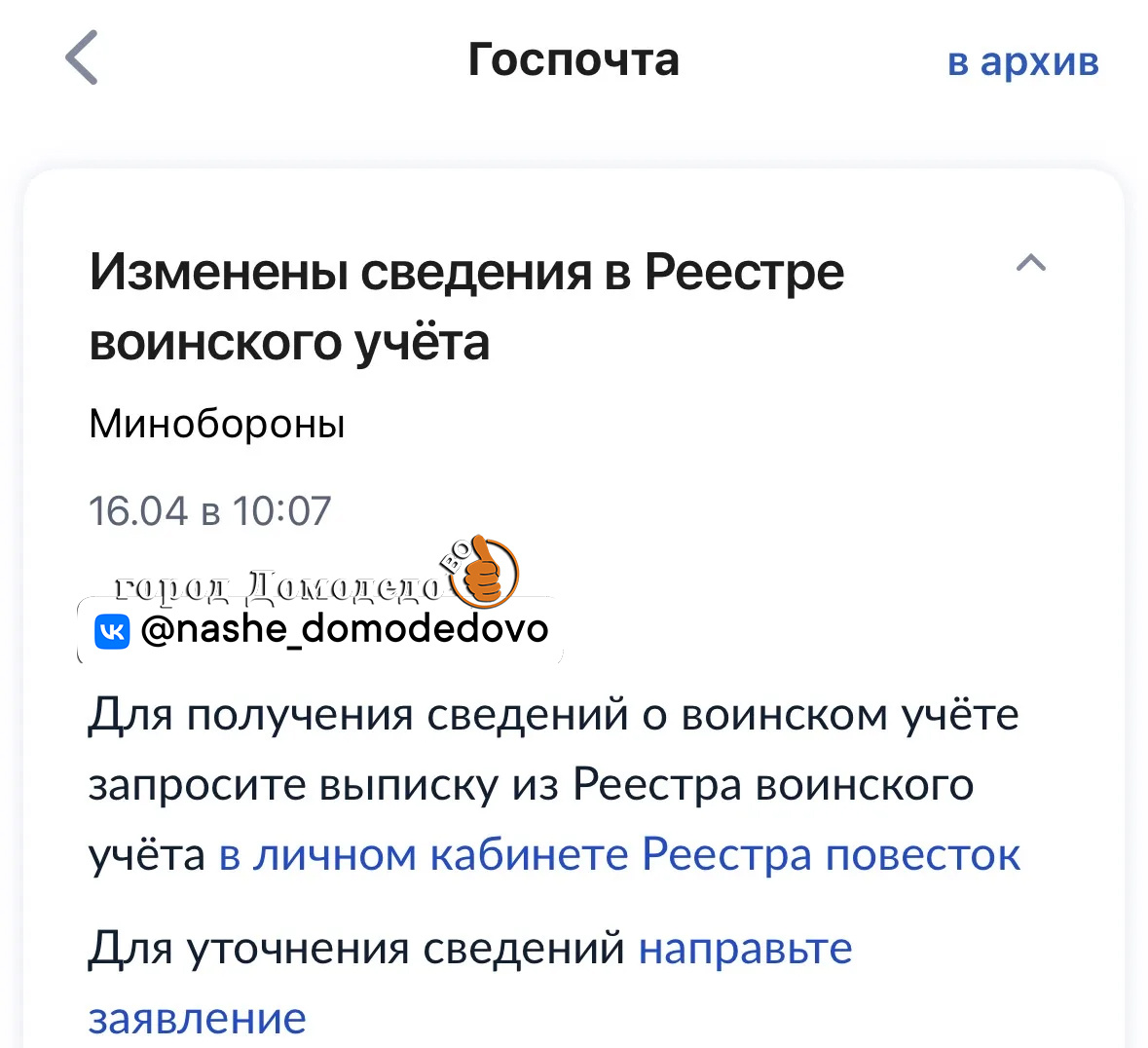 В последнее время домодедовцам поступают электронные письма с темой «Изменены сведения в Реестре воинского учета», отправляемые с адреса no-reply@gosuslugi.ru и от имени портала «Госуслуги». В письмах указываются инструкции по получению информации: гражданам рекомендуется запросить выписку через личный кабинет на портале «Реестр повесток» или отправить заявление посредством системы Госуслуг для уточнения сведений. Многие СМИ пишут, с ссылкой на Министерство обороны Российской Федерации, что подобные электронные сообщения не являются никакими повестками и никак не связаны с призывной кампанией или мобилизационными мероприятиями. Основная функция этих уведомлений заключается в обновлении и поддержании актуальности информации в базе данных. Следует отметить, что подобные информационные сообщения получают не только те, кто состоит в запасе и имеет военный билет, но и граждане, которые ранее никогда не проходили воинский учет. Вам приходили такие письма? Мы в MAX max.ru/nashe_domodedovo Под