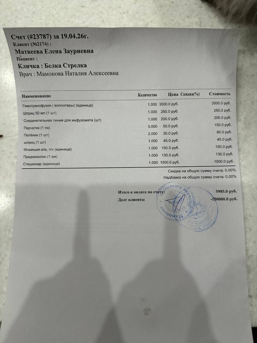 ! Не рассказывала, расскажу сегодня, сейчас. Это вот мой чек за Стрелку (Белка ее сестренка, у них общая карточка в ветклинике Химках с котяточек🤗) В химках за трансфузию. Ценность этой бумажки в цифирках ниже - ДОЛГ! еще по осени он был 190.000 (а прежде и того больше) и я его НЕ увеличила аж до апреля 2026. Это было непросто при моих болеющих.. Даже уменьшила, при том, что обращения Химки были. Но я больше его не коплю, я погашаю. Я мечтаю.погасить долг и думала, что вот-вот смогу и... С понедельника все изменилось😭 И этот вот долг в 150.000 опять ушел в рост😭😭😭 Нет, не из-за Стрелки.Стрелку я благодаря вам оплатила! И даже чуть больше закинула, округлить сумму долга Но у жизни на меня и мои дела свои планы 😭😭😭 Больше долга в 150.000 в Химках нет! Он начал стремительно расти!!!! Не успела я и мы с вами нарадоваться успехами Стрелки, как вот опять... Теперь Рыжуля и она в стационаре! Ей нужгы инфузии... Она давно куксилась, но она дикая! Совершенно не подходит да