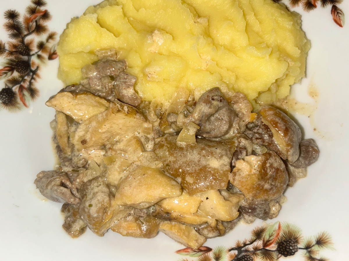 Говядина тушеная с белыми грибами в сметанно-горчичном соусе
