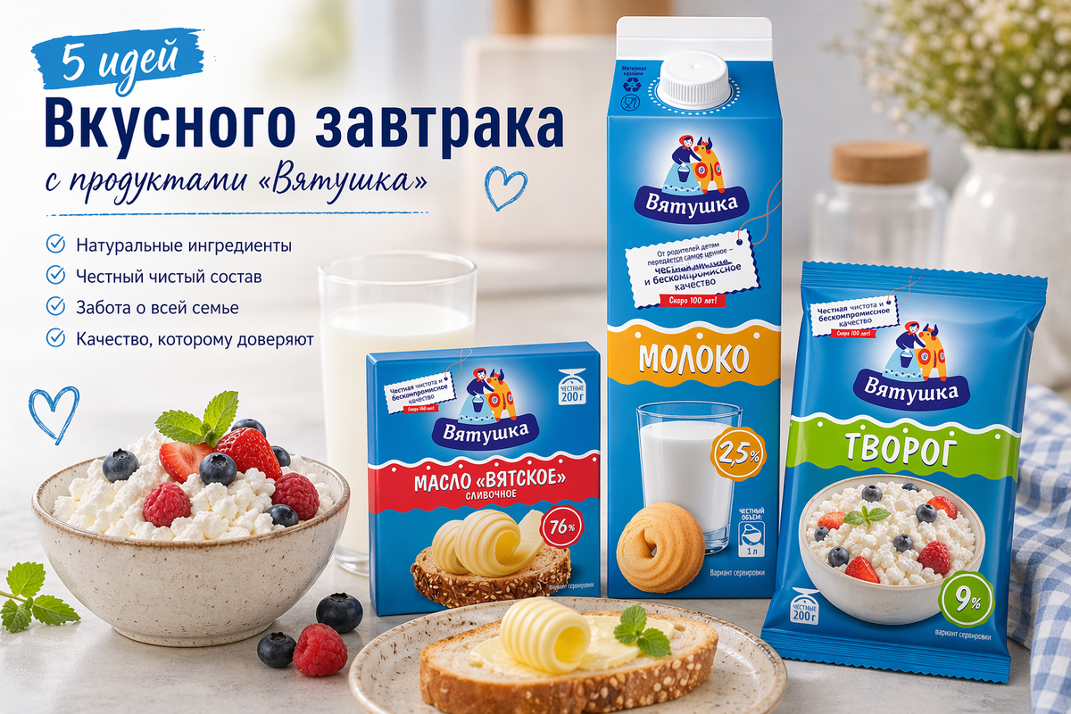 Часто самые уютные завтраки — это как раз самые понятные: творог с ягодами, каша на молоке, тост с маслом, сырники со сметаной или любимый кисломолочный напиток, который удобно взять с собой. Мы собрали 5 простых идей завтрака с продуктами «Вятушка», которые легко повторить дома — и в будни, и в выходные. Иногда лучший завтрак — тот, который не требует почти никаких усилий.