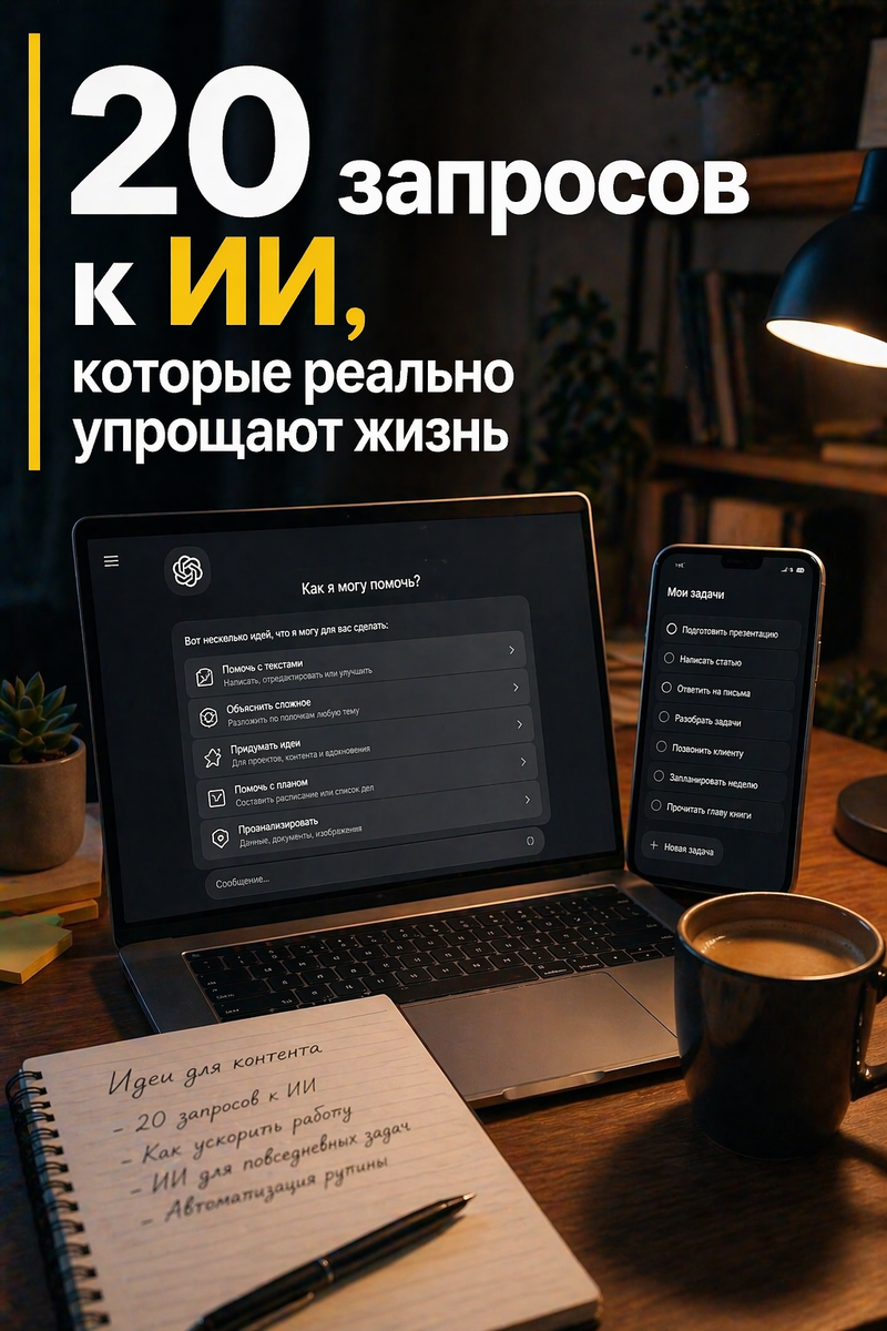 С ИИ у многих одна и та же проблема: вроде штука умная, а толку в жизни мало. Обычно не потому, что ИИ плохой, а потому, что ему задают слишком общие вопросы. В ответ он и выдает такую же общую кашу. А вот когда запрос нормальный, он реально экономит время: на сообщениях, покупках, еде, работе, поездках и всей той мелочи, которая съедает день по кускам. Ниже 20 запросов, которые можно просто брать и использовать. Не для “поиграться с нейросетью”, а чтобы меньше возиться с рутиной. 1. Разбей мои дела на сегодня по важности и составь план до вечера.