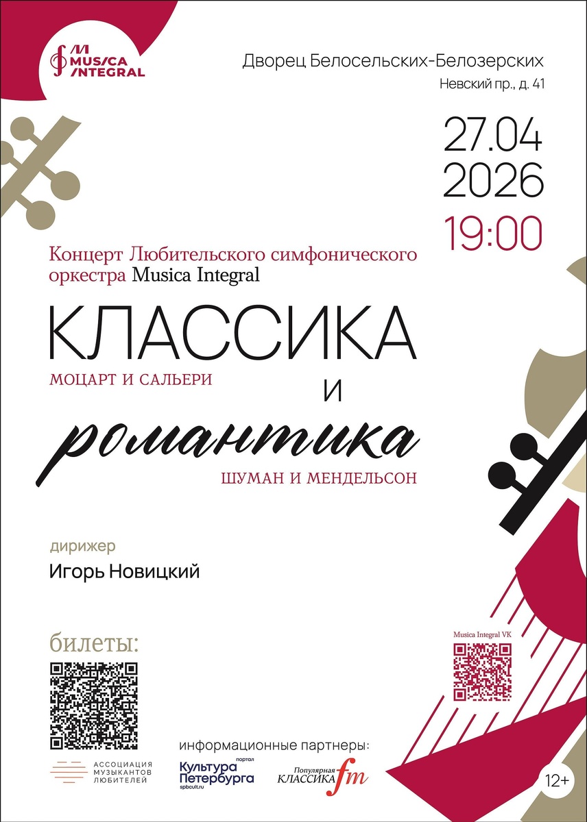 Любительский симфонический оркестр Musica Integral, состоящий из представителей самых разных, не связанных с музыкой профессий, приготовил для слушателей новую программу, которую исполнит 27 апреля 2026 года на сцене Дворца Белосельских-Белозерских в Санкт-Петербурге. https://www.classicalmusicnews.ru/anons/lyubitelskij-simfonicheskij-orkestr-musica-integral-ispolnit-muzyku-venskih-klassikov-i-nemeczkih-romantikov/?utm_source=cmn_own&utm_medium=telegram 🎼 ClassicalMusicNews.Ru | Telegram | ВК | МАКС