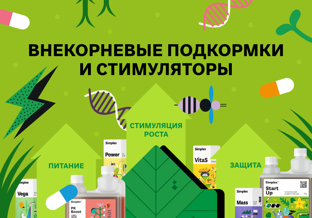 - Биостимуляторы Simplex® «Масса» (Mass), «ВитаС» (VitaS) — разгон метаболизма и антистресс. Лучше работают в паре с основными удобрениями.