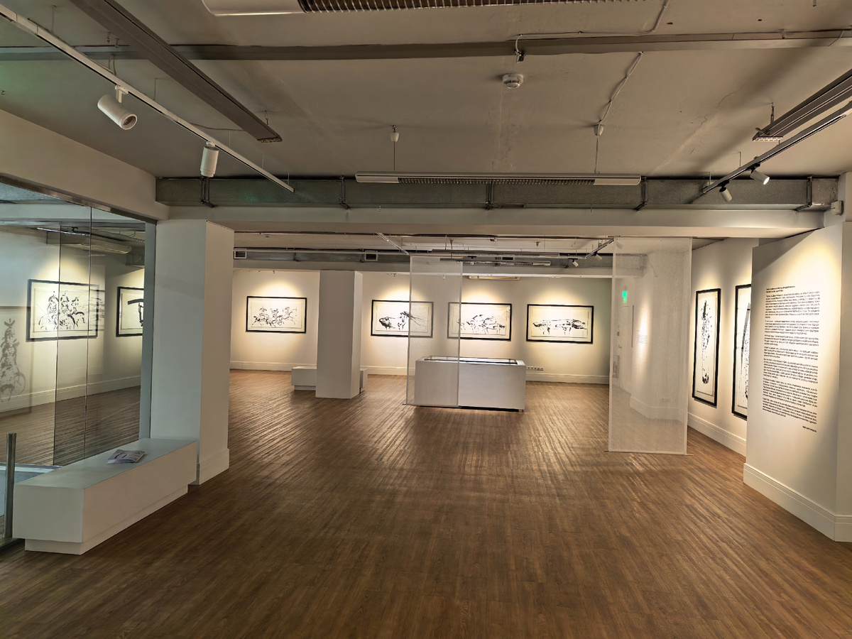 В зале такое музыкальное сопровождение, что когда я медленно шла между островками рисовой бумаги, по которой брызгами и линиями чёрной туши разошлась фантазия Даши Намдакова, я как будто медитировала. Нам с родственницей повезло побыть в зале вдвоём, и, хотя мы те ещё болтушки, мы разошлись по залу и даже помолчали, пытаясь вникнуть в мыслеобразы художника.