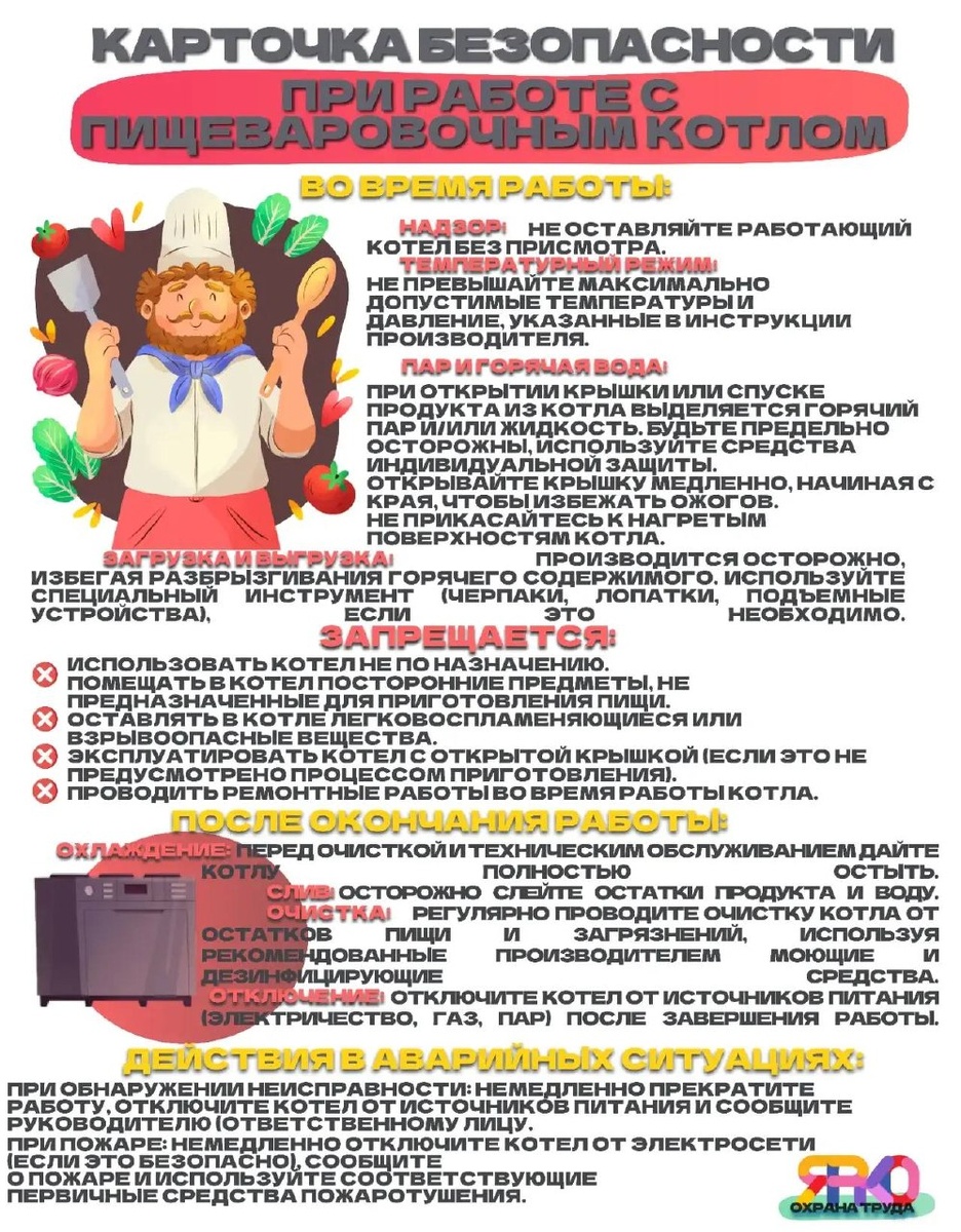 ! На кухне он помогает готовить быстро и удобно, но требует внимательности на каждом этапе. 👀 Во время работы Не оставляйте котёл без присмотра. Следите за температурой и давлением — работаем только в пределах нормы. 💨 Осторожно: пар и горячая вода При открытии крышки может выйти горячий пар или жидкость. Открывайте крышку медленно, с края, и обязательно используйте СИЗ. 🥄 Загрузка и выгрузка Действуйте аккуратно, чтобы не было брызг. Если нужно — используйте черпаки, лопатки или подъемные устройства. ⛔ Что делать нельзя — использовать котёл не по назначению; — класть внутрь посторонние предметы; — оставлять легковоспламеняющиеся или взрывоопасные вещества; — работать с открытой крышкой, если это не предусмотрено; — проводить ремонт во время работы. 🧼 После окончания работы Дайте котлу полностью остыть. Осторожно слейте остатки продукта и воды, затем очистите и продезинфицируйте оборудование. 🔌 Не забудьте отключить После работы котёл нужно отключить от всех источников питан