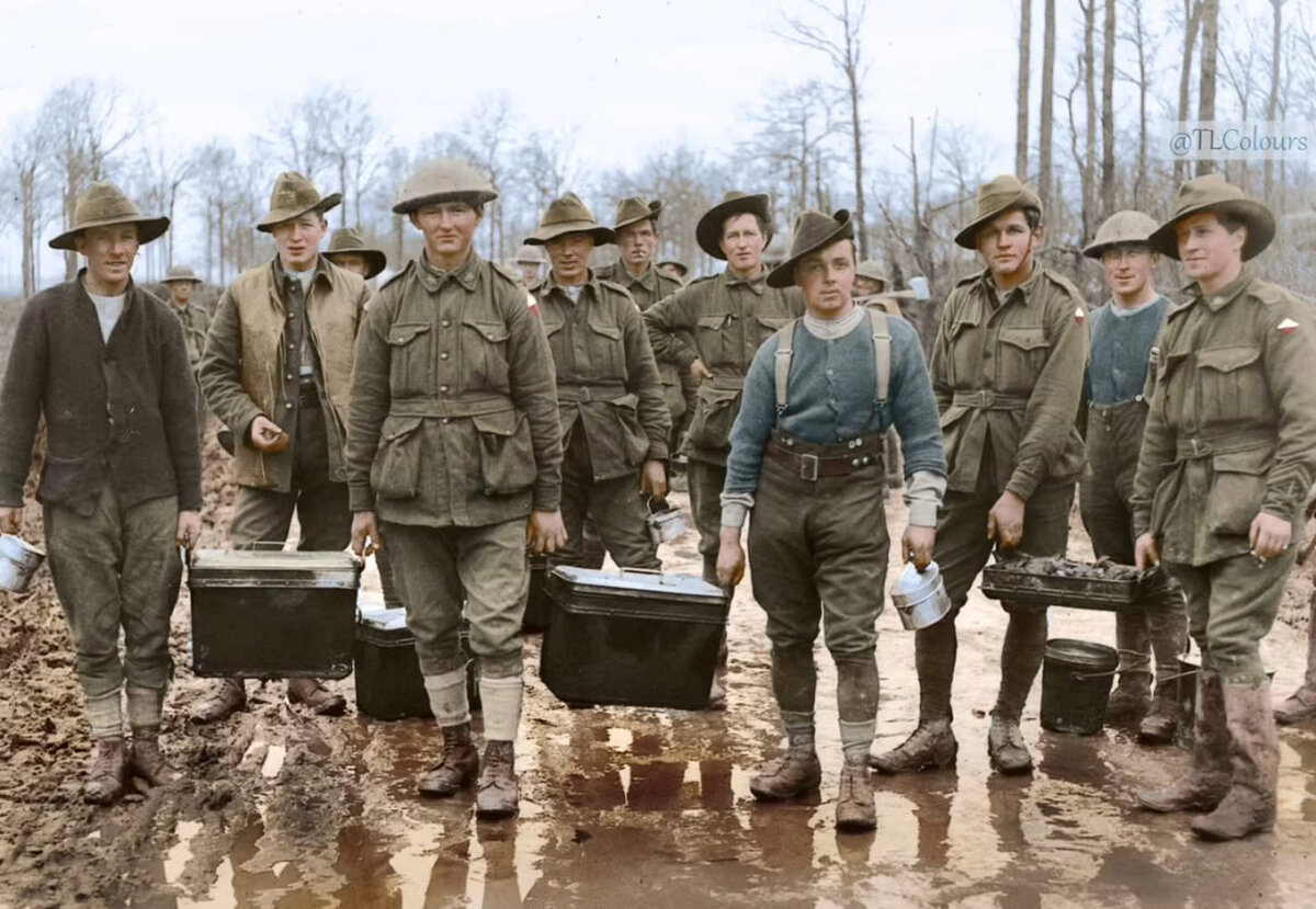 Австралийские солдаты несут горячий суп резервистам возле Хайд-парк-Корнер в Западной Фландрии, Мессин, Бельгия
