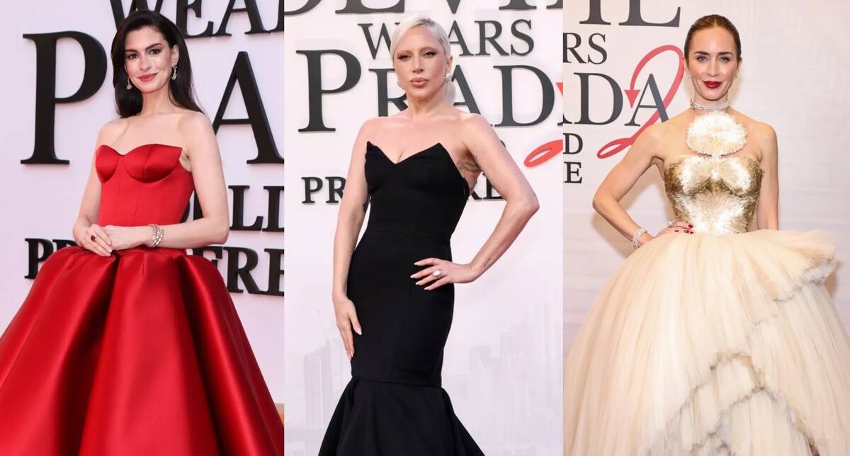 Нью-Йорк, 20 апреля. Линкольн-центр, зал Дэвида Гаффена. Мерил Стрип, Энн Хэтэуэй, Эмили Блант и Стэнли Туччи воссоединились спустя двадцать лет. Мерил Стрип появилась в красном, кожаном кейпе Givenchy от Сары Бёртон, длинные чёрные перчатки и тёмные очки. Идеальный образ для Миранды! Энн Хэтэуэй выбрала красное платье Louis Vuitton: строгий корсет без бретелей, чистая архитектура силуэта. Рядом с Мерил Стрип в том же оттенке она создавала эффект зеркала: две женщины, два разных понимания власти. Случайное совпадение? В мире, где каждый образ согласовывается заранее, случайностей на такой премьере не бывает. Эмили Блант сыграла на контрасте: Schiaparelli Haute Couture весна-лето 2026, расшитый бисером лиф и пышная юбка. Не красный, не громкий, но максимально роскошный кутюр. Блант всегда умела выиграть тихо. Леди Гага появилась в чёрном: длинное платье, платиновые волосы собраны назад, макияж не такой яркий, как обычно. После лет экстравагантных образов такая сдержанность воспр