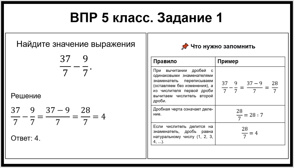 Разбор задания 1 ВПР по математике для 5 класса. Учимся вычитать дроби с одинаковыми знаменателями на примере 37/7 − 9/7. Найти значение выражения
