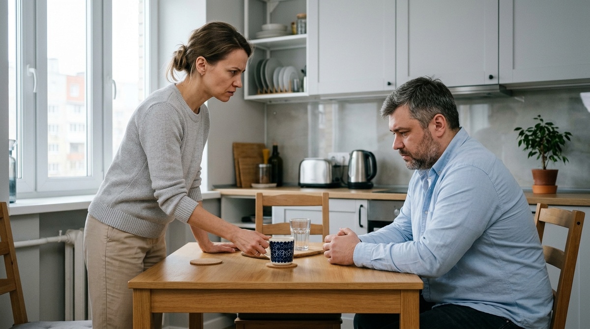 На кухне за столом сидел Витя, крупный, широкоплечий, в домашней футболке, которая всегда чуть топорщилась на животе. Он смотрел в кружку так, будто там плавало решение всех его ошибок, а напротив него, прямая как линейка, сидела Раиса в светлой кофте и с аккуратно поджатыми губами.