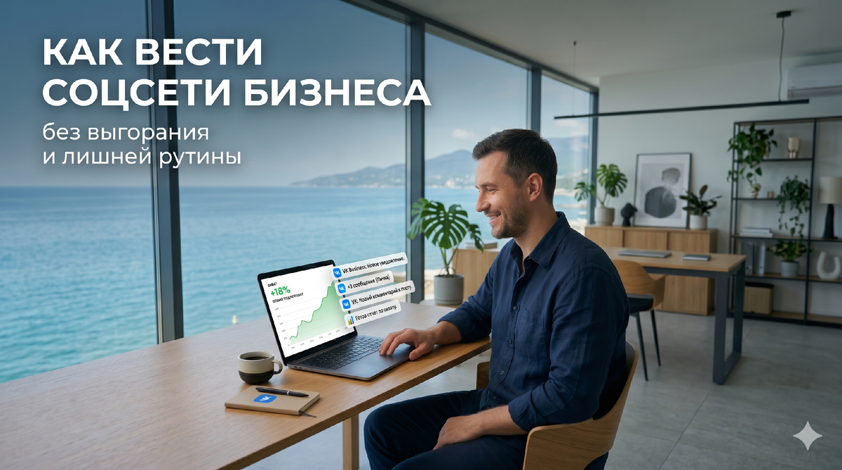 Пару лет назад я сидел на веранде у Черного моря, пил кофе и судорожно пытался придумать текст для клиента-стоматолога. Мой SMM-щик внезапно ушел в закат, а новый специалист запросил 60 тысяч рублей в месяц за простые картинки и пару абзацев скучного текста. Я тогда жестко выгорел из-за всей этой рутины. Я понял, что классический подход к созданию контента забирает слишком много ресурса, а предприниматель должен заниматься стратегией бизнеса, а не сочинениями. Ниже расскажу про то, как вести соцсети малого бизнеса простым языком. Без воды, опираясь на свои 10 лет практики. Вы узнаете: как перестать сливать бюджеты, где брать идеи для публикаций, как работает умный автопостинг и почему нейросети - это ваш главный козырь.