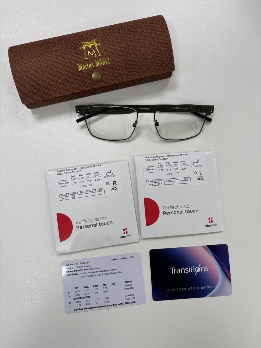 👓 📄У нашего пациента пресбиопия и вертикальное косоглазие, сопровождающееся двоением и требующее призматической коррекции. Так как величина призмы одинакова для всех расстояний, наши специалисты рекомендовали ему прогрессивную коррекцию. Она закрывает все зрительные потребности пациента — позволяет видеть четко на всех расстояниях и не испытывать двоения. ✍️Для решения этой задачи мы заказали самые современные прогрессивные линзы последнего поколения Shamir Autograph Intelligence в коэффициенте утончения 1.60. 🕶Дополнительно линзы оснащены функцией фотохром в насыщенном зеленом цвете и гидрофобным, антистатическим покрытием Glacier Plus, устойчивым к появлению царапин. Цвет идеально сочетается с оправой. Изделие выглядит стильно и обеспечивает максимальную остроту зрения на всех расстояниях. Подписывайтесь на наш канал: Наталья Ринская РИНОПТИКА в МАХ Центр коррекции зрения Натальи Ринской в ВK Наталья Ринская РИНОПТИКА 👓
