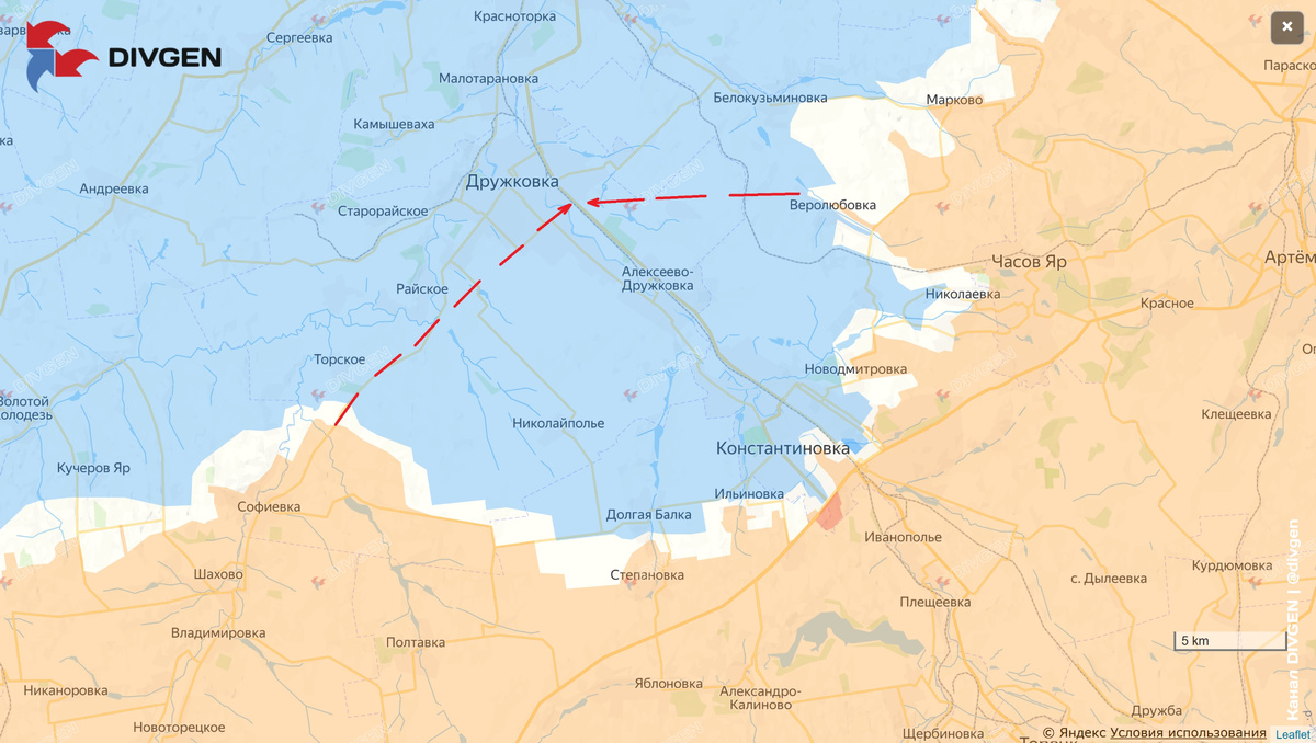 В Константиновке продолжаются тяжелые бои. Пр-ку удалось остановить наш прорыв на окраинах Долгой Балки, что предопределило продолжение уличных боев в Ильиновке. Тем не менее, нашим бойцам удалось выйти в городе на ул.Мирошниченко. Но пр-к выдавил нас из м/р Гора, с улиц Бахмутская и Минская. Очевидно, до полного осв-ия Ильиновки и Новодмитровки ожидать принципиальных изменений ЛБС в Константиновке не приходиться. Зато в Сумской области наши создали ситуацию, при которой в стане врага истерика. С моей точки зрения преждевременная, но вражеские военкоры орут об угрозе окружения облцентра. И на самом деле хорошо видно, что фронт в востока и даже ЮВ медленно сдвигается к Сумам. Это уже не узкий клин с севера – это широкая дуга. Причем наши существенно продвинулись и к Мирополью, и к Таратунино много южнее. Что требует от врага подтягивания серьезных резервов. Многие из которых были переброшены к северу от Сум – здесь наши наступают фронтом шириной до 50-ти км. НА ЗФ наши сумели перерезат