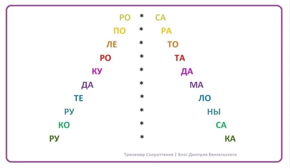 🔼Цветная буквенная пирамида Как выполнять: необходимо смотреть в центр таблицы и постепенно спускаться вниз, соединяя периферическим зрением половинки слов. Возраст: 8+ О детях в МАХ