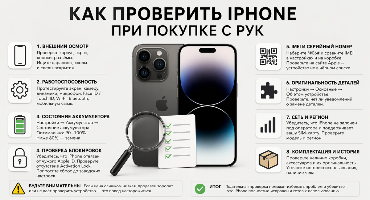 Покупка iPhone с рук может сэкономить деньги, но и несёт риски — от скрытых дефектов до блокировки устройства. Ниже — подробное руководство, как проверить iPhone перед покупкой, чтобы не попасть в неприятную ситуацию. Начните с базового — состояния корпуса: Любые серьёзные повреждения — повод торговаться или отказаться. Протестируйте основные функции: Перейдите: Настройки → Аккумулятор → Состояние аккумулятора. Также обратите внимание на сообщение о неоригинальном аккумуляторе. Обязательно убедитесь, что iPhone не привязан к чужому аккаунту: Это защита iCloud (Activation Lock). Если она активна — пользоваться телефоном вы не сможете. Наберите: *#06# — появится IMEI. Сравните IMEI: Проверьте IMEI на официальном сайте Apple. Что важно: После ремонтов могут стоять неоригинальные запчасти. Зайдите: Настройки → Основные → Об этом устройстве. Проверьте: iOS может показывать уведомление о замене деталей. Есть ли коробка и совпадает ли серийный номер. Это не обязательно, но повышает доверие к