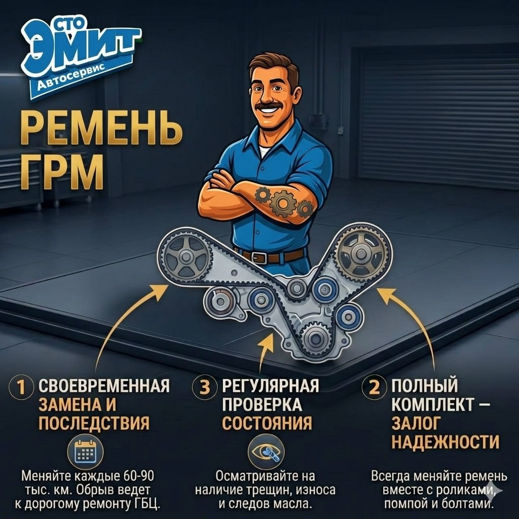 ⚙️РЕМЕНЬ ГРМ — коротко о главном Интервал замены: •60 000 - 90 000 км ( осмотр каждые 30 тыс) • Или ≈4 года ‼️ Признаки, что пора менять 🤩возраст ремня ~4 года - резина стареет 🤩свист из под капота при запуске - ремень/ ролик 🤩следы масла на ремне - течет сальник 🤩трещины на ремне - срочная замена 🤩неизвестно когда меняли - меняй сразу 🤩двигатель стал работать неровно- возможно перескочил зуб Что менять вместе: ✅ Ремень ГРМ ✅ Натяжной ролик ✅ Помпа ✅ Сальники коленвала и распредвала Цена ошибки: • Обрыв ремня = загнутые клапана • Ремонт ГБЦ ≈50 тыс ₽ • Или замена мотора 😟 Не знаешь, когда меняли — меняй сразу❗️ На ремне не экономят ☝️Покупай только проверенные запчасти Остались вопросы ? Пиши 👇 или записывайся на диагностику