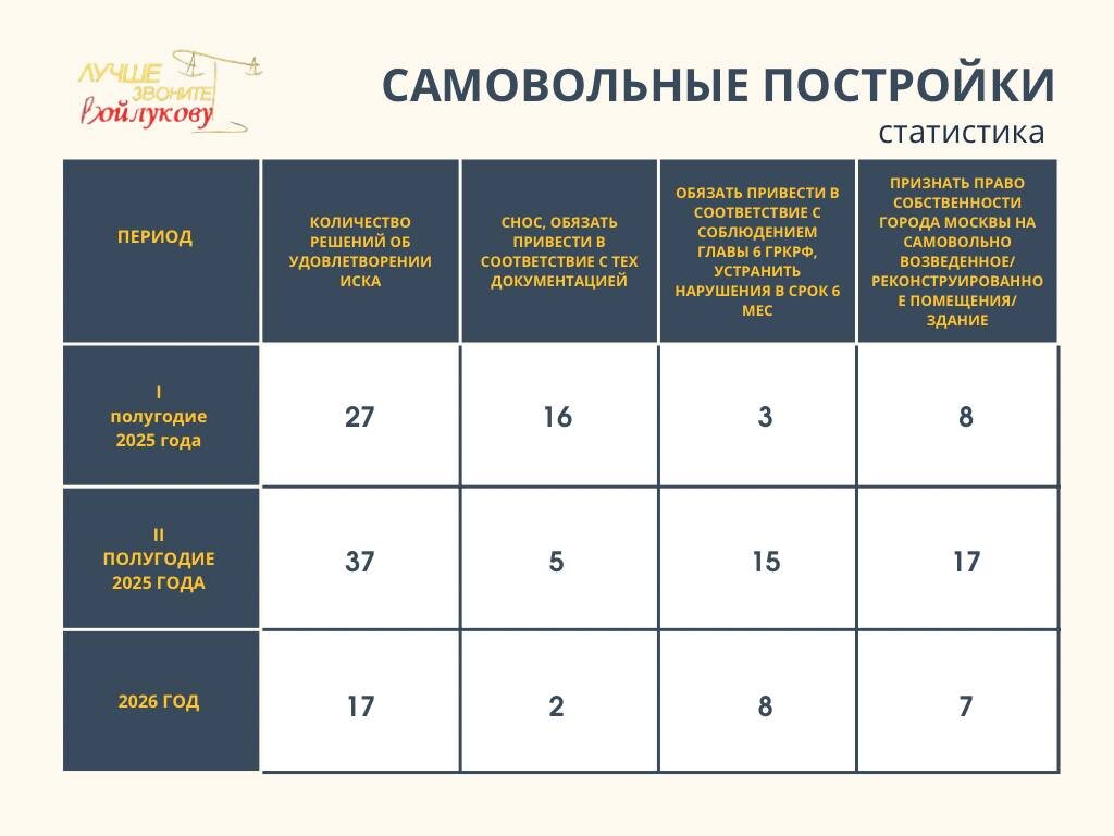 В преддверии выхода большой статьи на Дзене и Подкаста, хочу немного поспойлерить в канале и поговорить на тему альтернативных судебных решений по спорам с самовольными постройками. Изучая судебную практику, мы с командой обратили внимание на любопытную статистику, которая набирает обороты. Сразу скажу: статистика примерная, основана на поиске свежих дел в «Консультанте». Мы специально не высчитывали и не сверяли каждое дело - хотели лишь уловить тенденцию. Но если считать то цифры явно будут соразмерно больше. Что показывает эта простая таблица? (См. таблицу выше) ⏫ 1️⃣Первое: количество решений о сносе (отрицательных для собственника) растёт. Первый квартал 2026 года уже опережает аналогичный показатель прошлого года. 2️⃣Второе: суды начали заменять прямой снос на обязанность соблюсти требования главы 6 ГрК РФ (получить разрешение на ввод в эксплуатацию). Многие суды избегают даже дополнительных экспертиз, полагая, что в рамках вынесенного решения можно исправить ключевые нарушен