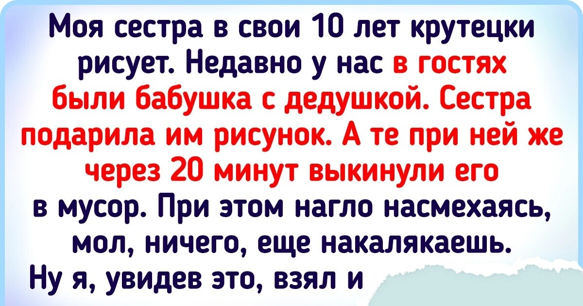 «Какая бестактность!» — так и тянет сказать некоторым людям. Они запросто могут нагрубить в магазине, задать неприличные вопросы, влезть с непрошенными комментариями. Наши герои поведали истории о том, как повстречали подобных субъектов. Моя сестра в свои 10 лет крутецки рисует. Недавно у нас в гостях были бабушка с дедушкой — родители отца. Сестра подарила им рисунок. А те сказали «спасибо» и при ней же через 20 минут выкинули его в мусор. При этом нагло насмехаясь, мол, ничего, еще накалякаешь. Моего отца не было дома, а мама настолько была в шоке, что даже сказать ничего не смогла. Сестра заплакала. Ну я, увидев это, взял и собрал бабушке и дедушке их вещи. Снял им отель недалеко от нас и сказал, что все следующие вопросы будем решать после извинений и после разговора с отцом. Они обиделись и не звонят. А я скинул денег им на обратные билеты и совершенно не жалею о своем поступке. Сын рыжий, мы с мужем — нет. Такая особенность досталась в наследство от мужниной бабушки. На тему, отк